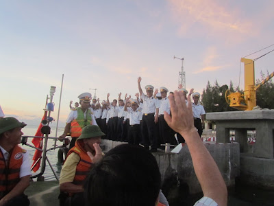 Thả neo tàu cho bộ phận mặt boong lẻng xẻng thả neo, hạ xuống chuyển tải, đã thấy nhiều thành viên trong Đoàn Công tác lục tục thức dậy, buộc chặt dép nhựa, thắt chặt miệng túi bảo quản, chờ lúc gọi tên xuống xuồng vào đảo.