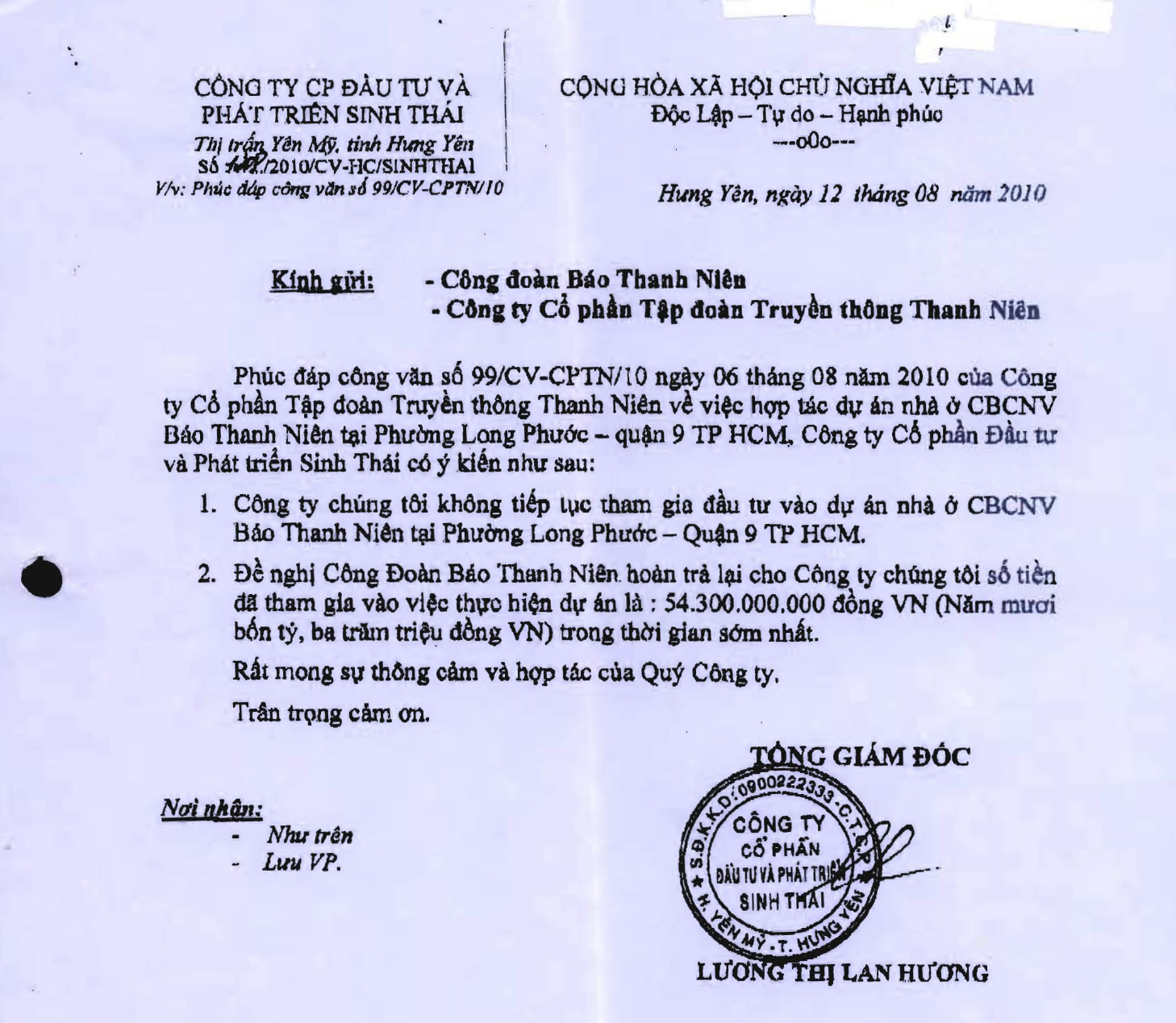 Ngày 02/06/2006, UBND Thành phố Hồ Chí Minh ban hành văn bản số 3570/UBND-ĐT về việc chấp thuận cho Công đoàn Báo Thanh Niên lập dự án “Khu nhà ở Cán bộ – phóng viên – nhân viên Báo Thanh Niên” tại phường Long Phước, Quận 9. Đây là niềm vui lớn đối với toàn thể cán bộ, công nhân viên tờ báo khi việc sở hữu một mảnh đất, một căn nhà so với mức lương của nghề báo lúc đó vẫn chỉ là một ước mơ ngoài tầm với. Sau nhiều lần họp bình xét, Công đoàn mới quyết định được danh sách nhân sự được hưởng quyền lợi gồm 58 cán bộ có đóng góp, thâm niên, có thể kể đến như: Lê Văn Quý (văn phòng), Đàm Văn Thanh Huy (Ban Chính trị-Xã hội), Võ Thị Tạo (Ban Bạn đọc), Cao Minh Phát (Thanh Niên tiếng Anh), Trần T.Hoàng Anh (Ban Văn nghệ), Dương Quốc Hùng (Phòng Quảng cáo), Trương Nguyễn Mỹ Hạnh (Ban Thư ký),… Những cán bộ, công nhân viên này đã tìm mọi cách gom góp, vay mượn nhằm kiếm đủ số tiền góp vốn mua đất với giá từ 100-300 triệu đồng/lô, đây là những khoản tiền lớn vào thời điểm đó. Tổng số tiền huy động được từ cán bộ, công nhân viên Báo Thanh Niên lên tới 12,75 tỷ đồng. Mỗi cán bộ, công nhân viên đều háo hức, chờ đón ngày cầm trong tay quyển sổ đỏ mang tên chính mình nhưng có ngờ đâu…