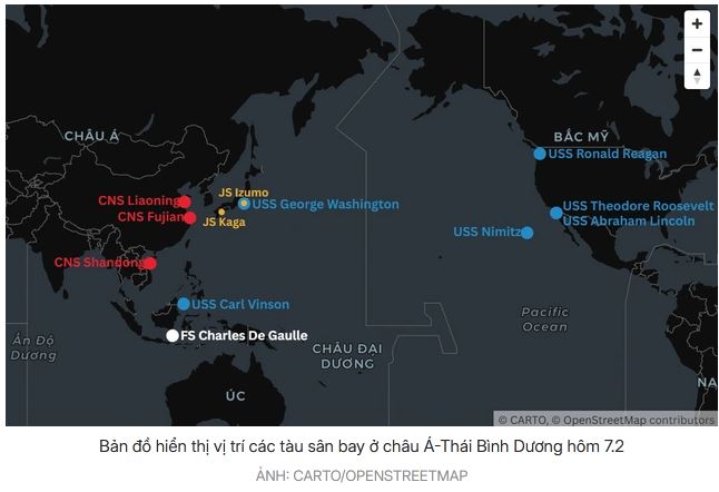 Tính đến ngày 7.2, bản đồ do Newsweek cập nhật cho thấy vị trí của các tàu sân bay Mỹ ở châu Á-Thái Bình Dương. Còn 2 trong số 3 hàng không mẫu hạm Trung Quốc ở căn cứ, và một tàu đang trong quá trình bảo trì trong ụ khô.