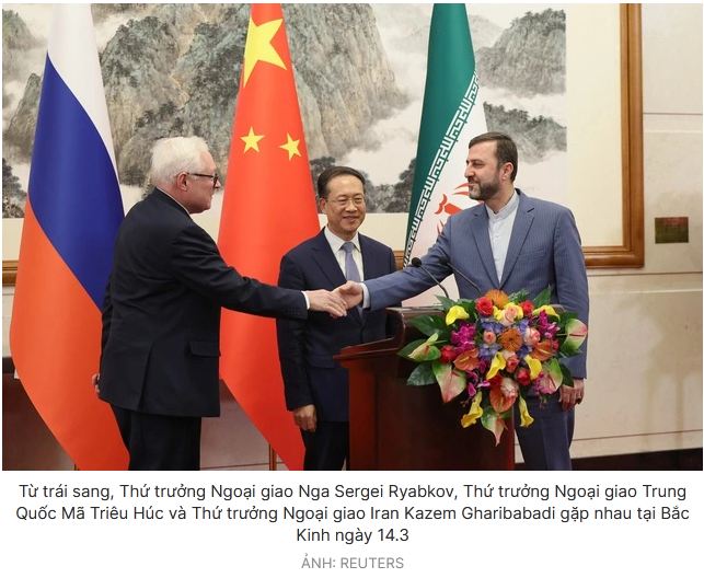 Ngày 14.3, Thứ trưởng Ngoại giao Trung Quốc Mã Triêu Húc đã có cuộc đối thoại về vấn đề hạt nhân Iran với người đồng cấp Nga Sergei Ryabkov và Iran Kazem Gharibabadi tại Bắc Kinh, theo Reuters.