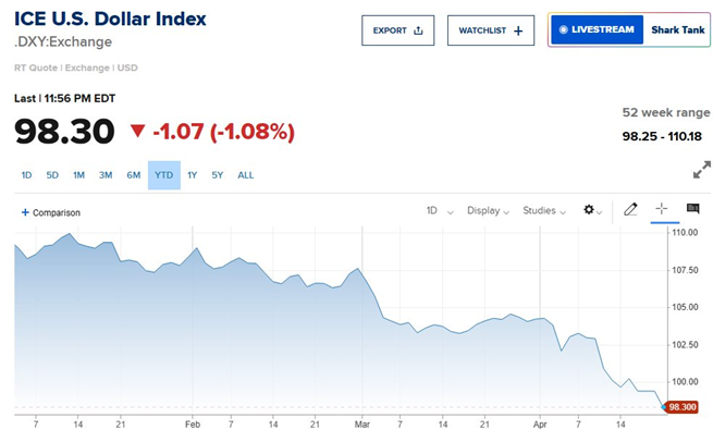 Đồng USD lâu nay được xem là biểu tượng của an toàn, nhưng nay lại trở thành tâm điểm lo ngại. Kể từ đỉnh giữa tháng 1, USD đã giảm hơn 9% so với rổ tiền tệ chính. Trong đó, gần 40% mức giảm diễn ra từ ngày 1/4, dù lợi suất trái phiếu kho bạc Mỹ kỳ hạn 10 năm tăng 0,2 điểm phần trăm.