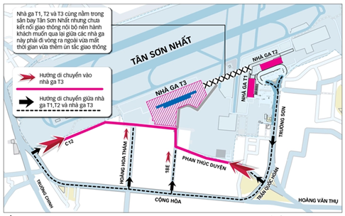 Dù ba nhà ga tại sân bay Tân Sơn Nhất gồm T1 (nội địa), T2 (quốc tế) và T3 (nội địa) nằm trong cùng một khuôn viên sân bay nhưng hành khách không thể di chuyển nội bộ trực tiếp giữa nhà ga T1 và T3 mà phải đi vòng ra các tuyến đường công cộng như Trường Sơn, Cộng Hòa, vốn thường xuyên kẹt xe.