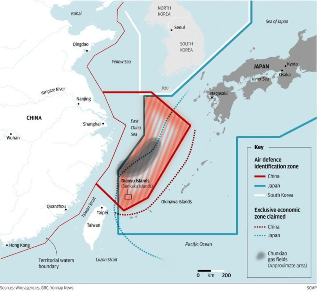 Năm 2013, Bộ Quốc phòng Trung Quốc tuyên bố rằng họ đã thiết lập ADIZ trên Biển Hoa Đông bao phủ không phận phía trên một chuỗi đảo đang tranh chấp giữa Trung Quốc và Nhật Bản. Sau đó, Bắc Kinh đã ban hành một bộ quy tắc cho vùng này, nói rằng tất cả các máy bay phải thông báo cho chính quyền Trung Quốc và phải chịu các biện pháp quân sự khẩn cấp nếu không tự nhận dạng hoặc không tuân theo lệnh của Bắc Kinh. Bộ Quốc phòng Nhật Bản kêu gọi cộng đồng quốc tế bác bỏ và phản đối hành động của Trung Quốc. Nhật Bản, cùng với Mỹ, Australia, Hàn Quốc và các nước khác, đã phớt lờ vùng phòng không và các quy tắc mà Trung Quốc tuyên bố.