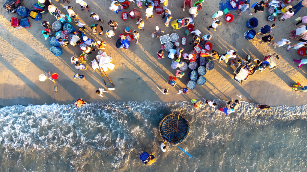 Sau một đêm lênh đênh trên biển, những chiếc thuyền thúng chở đầy tôm, cá, mực… tươi rói cập bờ, tạo nên khung cảnh mua bán tấp nập ngay trên bãi cát. Chợ chỉ kéo dài đến khoảng 7 – 8 giờ sáng nhưng đủ để mang lại trải nghiệm độc đáo cho du khách và người dân địa phương.