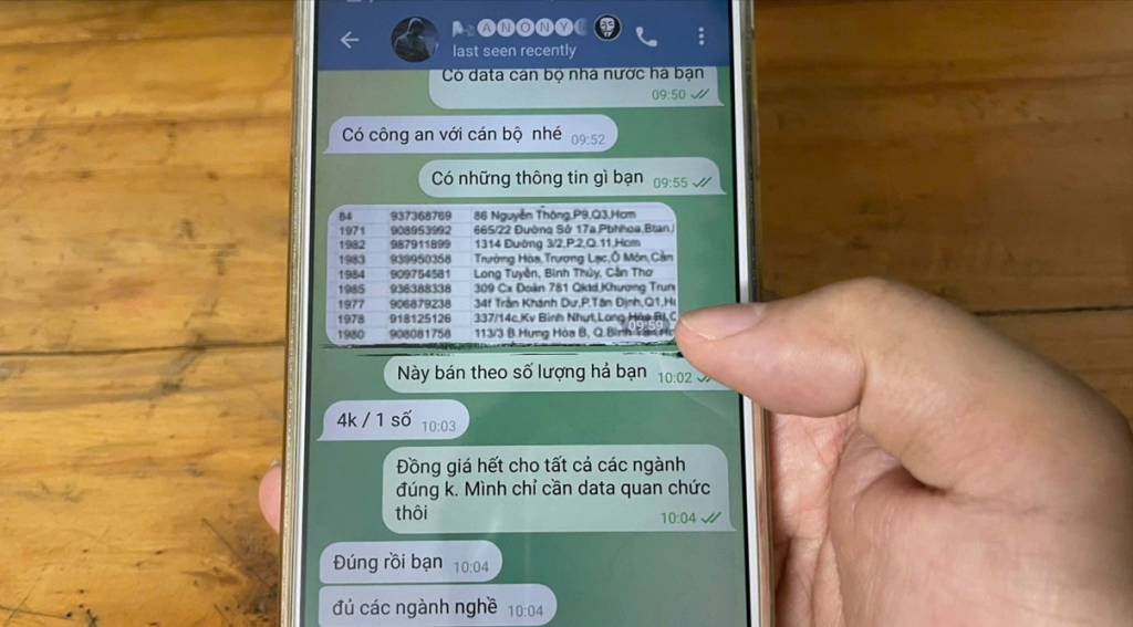 Sau lời quảng cáo trên fanpage, người mua có nhu cầu giao dịch được yêu cầu chuyển sang ứng dụng Telegram để trao đổi. Lần theo địa chỉ tài khoản Telegram, phóng viên kết nối với “đầu nậu” có tên” Anonymous. Lấy lý do cần dữ liệu cán bộ, “đầu nậu” này ngay lập tức gửi ngay danh sách khoảng 10 người trong đó có thông tin gồm họ tên, căn cước công dân, năm sinh, địa chỉ, số điện thoại, nghề nghiệp. Người này còn nói chúng tôi kiểm tra thông qua việc gọi điện thoại để xác thực thông tin là đúng.