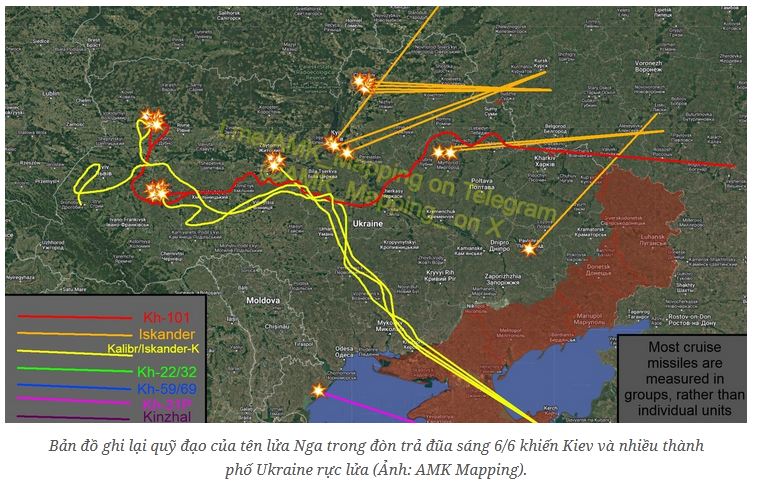 Ước tính của kênh AMK Mapping về cuộc tấn công bằng tên lửa của Nga vào Ukraine hôm nay 6/6 như sau: 10 tên lửa đạn đạo Iskander-M được phóng, 0 tên lửa bị đánh chặn; 13 tên lửa hành trình Kalibr được phóng, 2 tên lửa bị đánh chặn; 4 tên lửa hành trình Kh-101 được phóng, 1 tên lửa bị đánh chặn; 1 tên lửa Kh-31P được phóng, 0 tên lửa bị đánh chặn.