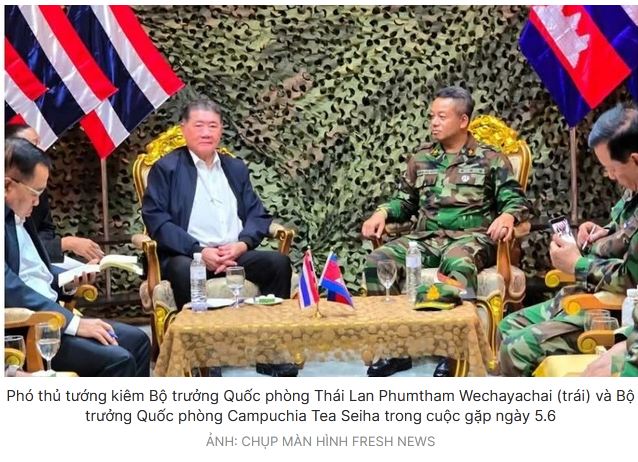 Cuộc thảo luận giữa Bộ trưởng Quốc phòng Campuchia Tea Seiha và Phó thủ tướng kiêm Bộ trưởng Quốc phòng Thái Lan Phumtham Wechayachai diễn ra tại huyện Aranyaprathet của tỉnh Sa Kaeo thuộc Thái Lan vào ngày 5.6, theo cổng thông tin Fresh News.