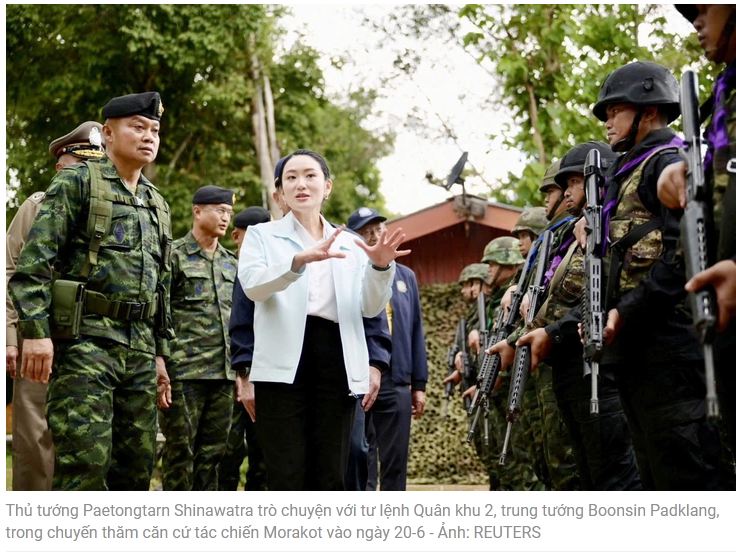 Trong nước, đường phố Bangkok sục sôi với các cuộc biểu tình vào ngày 19-6 đòi bà Paetongtarn từ chức vì “phản bội lợi ích quốc gia”. Quân đội, thế lực chính trị hùng mạnh ở Thái Lan, ít nhiều đã tỏ dấu hiệu bất mãn. Kinh tế Thái Lan lao dốc, áp lực đàm phán thương mại với Mỹ để né thuế quan từ Tổng thống Donald Trump càng thêm gánh nặng.