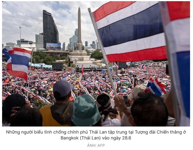 Hàng ngàn người biểu tình tụ tập tại Tượng đài Chiến thắng ở Bangkok (Thái Lan) hôm nay 28.6, yêu cầu Thủ tướng Paetongtarn Shinawatra từ chức vì cuộc điện đàm giữa bà và Chủ tịch Thượng viện Campuchia Hun Sen bị rò rỉ.