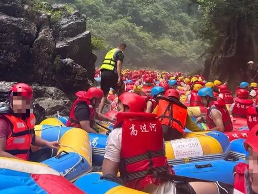 Hình ảnh chia sẻ cho thấy, trong hẻm núi nhỏ, có hàng trăm chiếc thuyền bơm hơi chồng chất lên nhau, nhiều người không thể di chuyển được và lâm vào cảnh “tiến thoái lưỡng nan”. Thậm chí, một số thuyền bị lật úp do va chạm khiến khách bị rơi xuống nước.