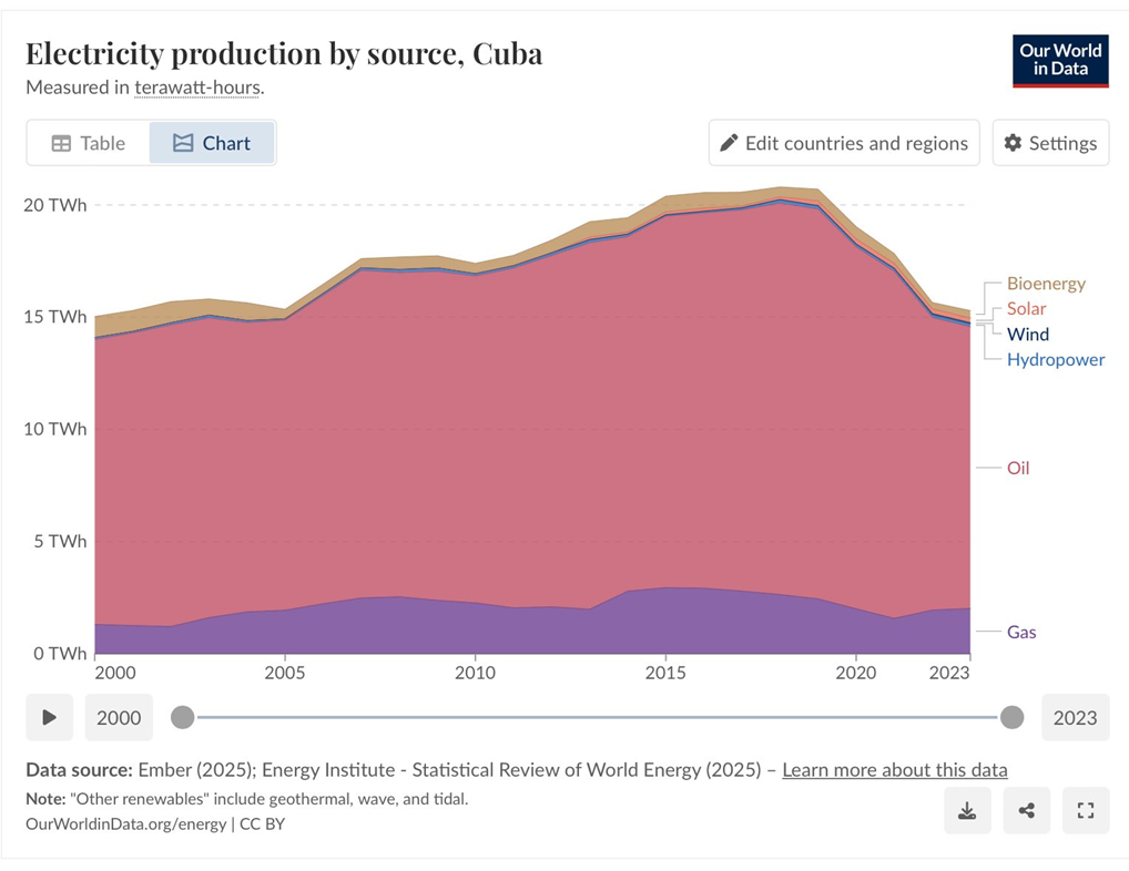 Cuba từ năm 2000 tiêu thụ điện cũng tăng hàng năm. Tuy nhiên, năm 2019 đạt đỉnh 20,7 tỷ kWh rồi từ đó đến nay cứ giảm dần và năm 2023 chỉ đạt 15,3 tỷ kWh. Bình quân điện đầu người chỉ chưa bằng một nửa Việt Nam, chỉ hơn Triều Tiên và Cambodia.