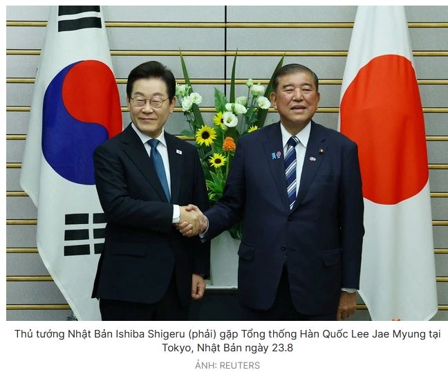 Tổng thống Hàn Quốc Lee Jae Myung ngày 23.8 có chuyến thăm chính thức đầu tiên tới Nhật Bản kể từ khi nhậm chức hồi tháng 6. Tại cuộc gặp giữa ông Lee với Thủ tướng Ishiba Shigeru ở thủ đô Tokyo của Nhật Bản, hai nhà lãnh đạo đã thảo luận về việc tăng cường quan hệ song phương Hàn Quốc – Nhật Bản, cũng như quan hệ 3 bên với Mỹ.