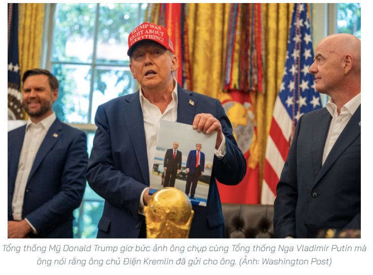 Ông giơ cao bức ảnh chụp ông đứng cạnh tổng thống Nga tại Anchorage mà ông nói rằng Tổng thống Putin đã gửi cho ông. Ông gợi ý rằng có khả năng ông Putin sẽ tham dự World Cup mà Mỹ sẽ đăng cai năm 2026.