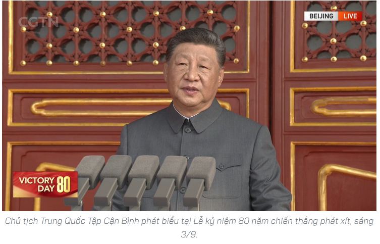 Sáng 3/9, phát biểu tại Lễ kỷ niệm 80 năm chiến thắng phát xít trong Thế chiến II, Chủ tịch Trung Quốc Tập Cận Bình nhấn mạnh, nhân dân Trung Quốc kiên định đứng về lẽ phải của lịch sử và tiến bộ của nhân loại, kiên trì con đường phát triển hòa bình, chung tay cùng thế giới xây dựng một cộng đồng chung vận mệnh.