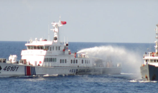 Người phát ngôn Cảnh sát biển Trung Quốc, ông Gan Yu, cảnh cáo phía Philippines đã xua hơn 10 tàu ra quấy nhiễu, xâm nhập bất hợp pháp “vùng biển của Trung Quốc” (!). Trung Quốc đã ngăn chặn bằng cách gọi loa, bật đèn tín hiệu nhưng “tàu lạ” vẫn không chịu tháo lui. Lực lượng Cảnh sát biển Trung Quốc (CCG) buộc phải dùng biện pháp mạnh phun vòi rồng vào các “con tàu lì lợm” gần bãi cạn Scarborough.
