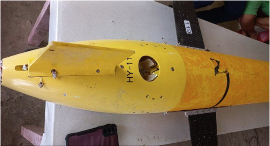 Vật thể dài gần 2 mét, có gắn cánh quạt, cảm biến và bộ thu phát tín hiệu, được cho là một loại drone dưới nước (underwater drone) dùng cho mục đích khảo sát hoặc trinh sát.
