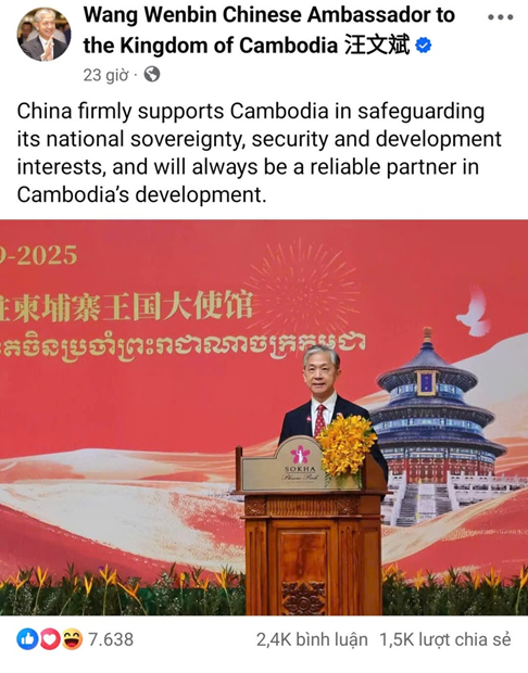 Tính đến 17h ngày 9-10, bài đăng trên Facebook của Đại sứ Trung Quốc tại Campuchia Uông Văn Bân đã thu hút 7.600 lượt thích và các tương tác khác cùng 2.400 bình luận và 1.500 lượt chia sẻ.