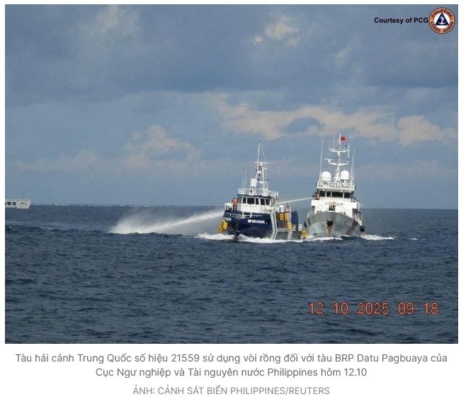 Trước khi Mỹ lên tiếng ủng hộ Philippines trong vụ va chạm trên Biển Đông, Bộ Ngoại giao Trung Quốc kêu gọi Manila không thách thức quyết tâm của chính quyền Bắc Kinh về “bảo vệ chủ quyền lãnh thổ và quyền lợi hàng hải”. Còn phía Philippines cáo buộc tàu hải cảnh Trung Quốc đã sử dụng vòi rồng và đâm vào một tàu của nước này ở quần đảo Trường Sa của Việt Nam hôm 12.10, theo Reuters hôm 14.10.