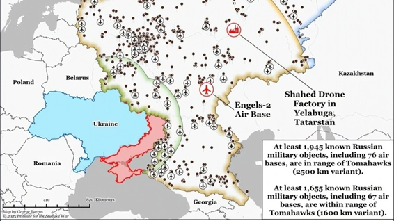 Theo phân tích của ISW, chỉ cần phiên bản Tomahawk tiêu chuẩn với tầm bắn 1.600km, Ukraine có thể tấn công tới 1.655 mục tiêu bên trong lãnh thổ Nga, bao gồm 67 căn cứ không quân. Với biến thể tầm xa 2.500km, con số này tăng lên 1.945 cơ sở quân sự và công nghiệp, trong đó có 76 sân bay chiến lược.