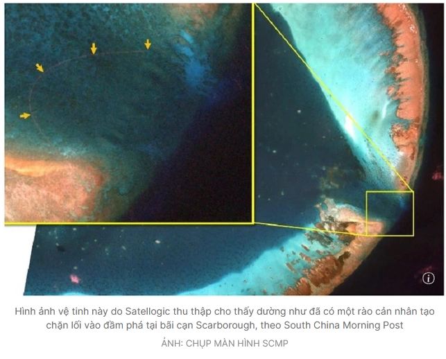 “Hình ảnh vệ tinh mới cho thấy một rào chắn nổi bất hợp pháp do Trung Quốc lắp đặt tại cửa bãi cạn Scarborough”, Ông Luke Fischer, Giám đốc điều hành kiêm đồng sáng lập SkyFi, một ứng dụng dữ liệu vệ tinh của Mỹ, viết trên mạng xã hội.