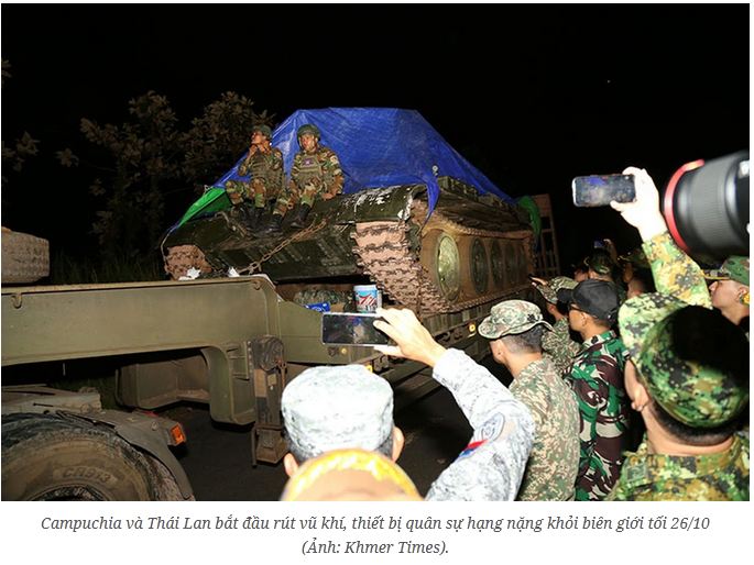 Dưới sự giám sát của Nhóm Quan sát viên ASEAN, tối 26/10, Campuchia và Thái Lan bắt đầu rút các loại vũ khí và trang thiết bị quân sự hạng nặng khỏi khu vực biên giới, đưa chúng trở lại các căn cứ quân sự thường trực của mỗi nước.