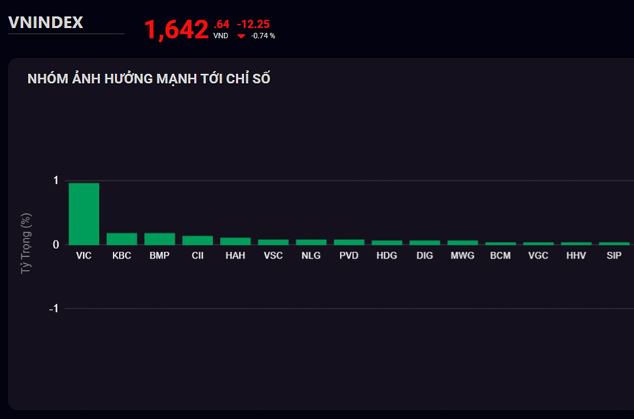 Chốt phiên giao dịch chứng khoán ngày 6/11, thị trường vẫn chìm trong sắc đỏ. VN-Index giảm hơn 12 điểm, về 1.642,64 điểm. Trên sàn HoSE, các mã giảm điểm lấn át cổ phiếu tăng giá. Thanh khoản ở mức thấp, chỉ hơn 17.863 tỷ đồng.