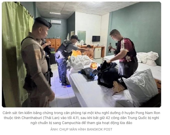Giới chức Thái Lan thông báo họ tin rằng 42 người Trung Quốc bị bắt giữ tại một khu nghỉ dưỡng ở tỉnh Chanthaburi tối 4.11 đang chuẩn bị vượt biên sang Campuchia để tham gia hoạt động lừa đảo qua các cuộc gọi.