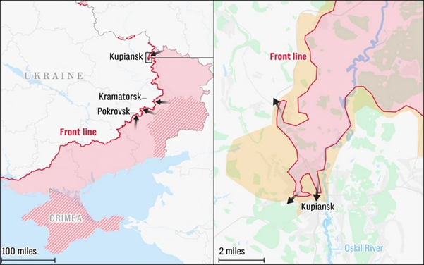 Theo bản đồ tình báo nguồn mở của nhóm DeepState, hiện nay quân đội Nga chiếm được khu vực phía Bắc của thị trấn Kupyansk, còn lực lượng Ukraine duy trì kiểm soát đối với khu vực phía Đông và Nam. Quân đội hai bên đang bị ghìm chân bởi hàng loạt UAV đối phương bay vù vù trên đầu thay vì giao tranh từ nhà này sang nhà khác.