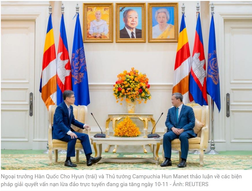 Theo Hãng tin Reuters, ngày 10-11, Bộ trưởng Ngoại giao Hàn Quốc Cho Hyun đã có cuộc gặp với Thủ tướng Campuchia Hun Manet, trong đó hai bên nhất trí tăng cường hợp tác chống lại các hoạt động lừa đảo trực tuyến và các loại tội phạm xuyên quốc gia khác.