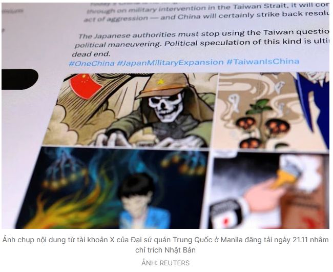 Kèm theo đó, các cơ quan ngoại giao của Bắc Kinh ở nước ngoài, điển hình như Đại sứ quán Trung Quốc ở Manila (Philippines) ngày 21.11 đăng một số hình ảnh có nội dung căng thẳng để quy kết Nhật Bản đang nỗ lực can thiệp quân sự vào vấn đề Đài Loan. Gần nhất, trong thư gửi Tổng thư ký LHQ Antonio Guterres, ông Phó Thông, Đại sứ Trung Quốc tại LHQ, tuyên bố: “Nếu Nhật Bản dám cố gắng can thiệp vũ trang vào tình hình xuyên eo biển, đó sẽ là một hành động gây hấn”.