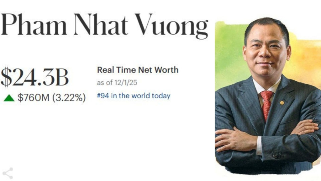 Ông Phạm Nhật Vượng là tỉ phú USD đầu tiên của Việt Nam sở hữu khối tài sản trên 24 tỉ USD, đồng thời là người Việt Nam đầu tiên nằm trong nhóm 100 người giàu nhất thế giới. So với đầu năm 2025, khối tài sản của ông Phạm Nhật Vượng đã tăng gấp 3,7 lần.