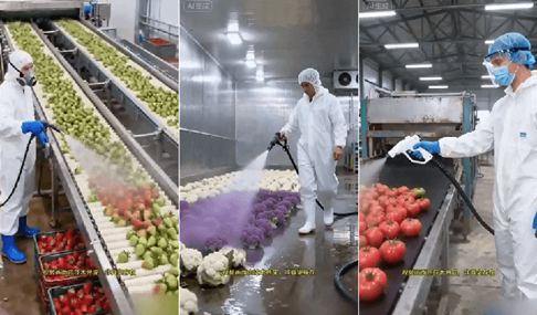 Kể từ đầu tháng 12, một đoạn video lan truyền mạnh trên các nền tảng như X, Instagram, Facebook cho thấy những người mặc đồ bảo hộ kín đang phun hoặc bôi một chất lạ lên các loại trái cây và rau củ còn xanh.