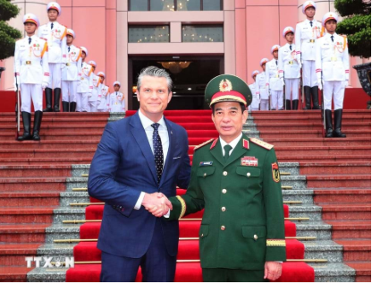 Ảnh. Bộ trưởng Quốc phòng Việt Nam Phan Văn Giang đón Bộ trưởng Bộ Chiến tranh Hoa Kỳ Pete Hegseth tại Hà Nội, ngày 2-11-2025