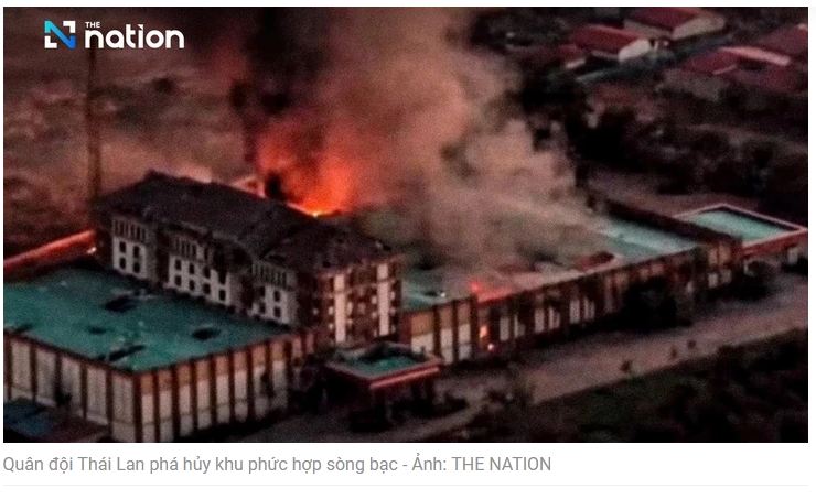 Tối 16-12, hai trang Facebook của Quân đội Hoàng gia Thái Lan đã đăng hai đoạn video cho thấy khu phức hợp sòng bạc bị trúng đạn pháo bắn từ xe tăng, trước khi khu phức hợp bốc cháy dữ dội.