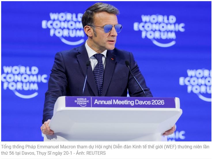Phát biểu tại Davos hôm 20-1, Tổng thống Macron khẳng định châu Âu sẽ không nhượng bộ trước các hành vi bắt nạt hay bị đe dọa, đồng thời chỉ trích gay gắt việc ông Trump dọa áp thuế cao nếu châu Âu không chấp nhận để Mỹ tiếp quản Greenland.
