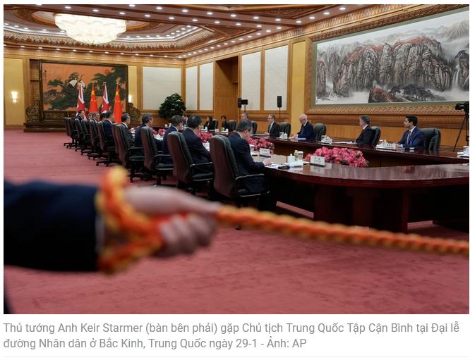 Ngày 29-1, Thủ tướng Anh Keir Starmer đã gặp Chủ tịch Trung Quốc Tập Cận Bình tại Bắc Kinh với hy vọng tăng cường quan hệ kinh tế song phương, báo hiệu bước đột phá trong quan hệ hai nước sau nhiều năm không tin tưởng nhau, theo Hãng tin Reuters.