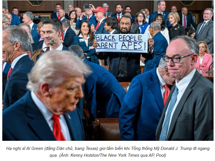 Gần 30 nghị sĩ Dân chủ tẩy chay bài phát biểu. Dân biểu Al Green bị đưa ra khỏi phòng họp khi giơ biểu ngữ phản đối: “Người da đen không phải loài vượn”. Sự kiện ấy không chỉ là một khoảnh khắc kịch tính, mà là tấm gương phản chiếu một nước Mỹ chia rẽ sâu sắc.