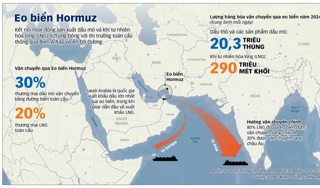 “Khoảng 1/5 lượng dầu và khí tự nhiên hóa lỏng (LNG) toàn cầu chảy qua eo biển Hormuz. Nó là động mạch chủ của hệ thống năng lượng toàn cầu”, Hãng tin AP dẫn lời chuyên gia Stephen Innes của tổ chức SPI Asset Management bình luận.